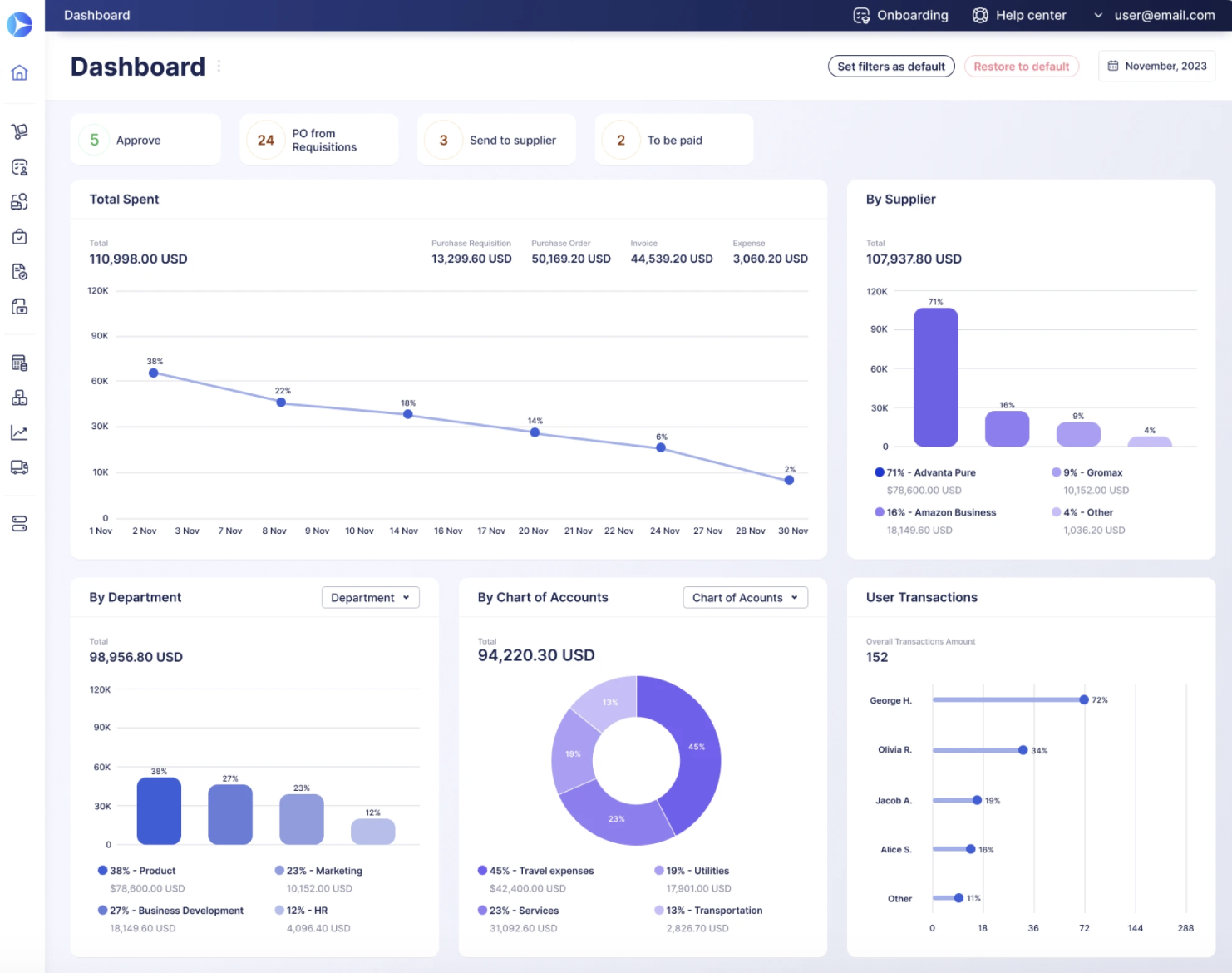 Procurify es una plataforma de gestión de compras y proveedores que ayuda a las empresas a optimizar sus procesos de adquisición y a gestionar las relaciones con sus proveedores. La herramienta incluye funcionalidades para la gestión de presupuestos, aprobación de compras y seguimiento de órdenes.