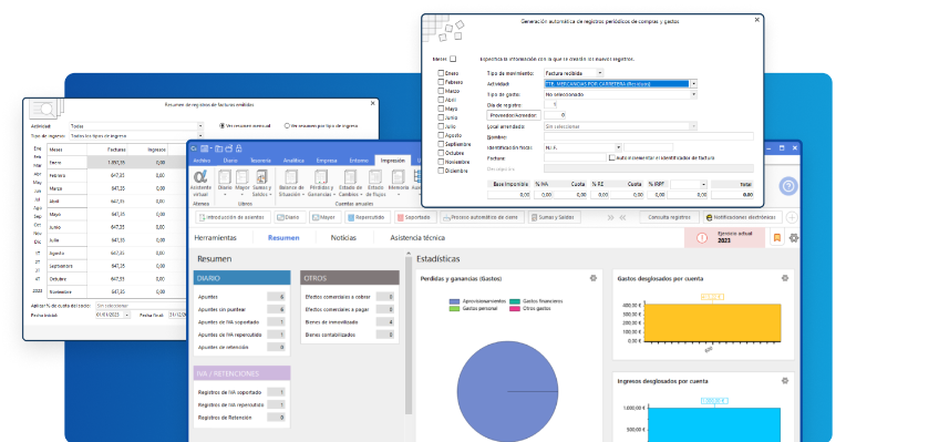 - Fiscal (diferentes regímenes fiscales, registro de facturas, cálculo de modelos fiscales, etc.).