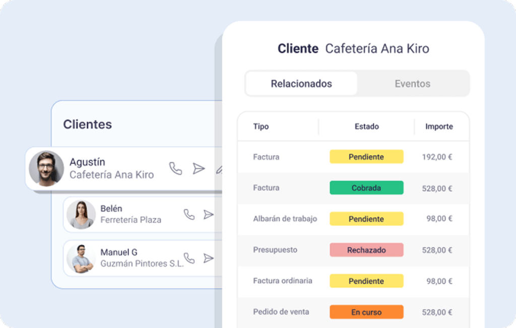 Registra todos tus contactos, observaciones, clientes potenciales y consulta todos sus informes. Usa plantillas para mejorar la comunicación y agilizar tu actividad comercial: convierte presupuestos en pedidos, gestiona entregas con firma y mucho más.