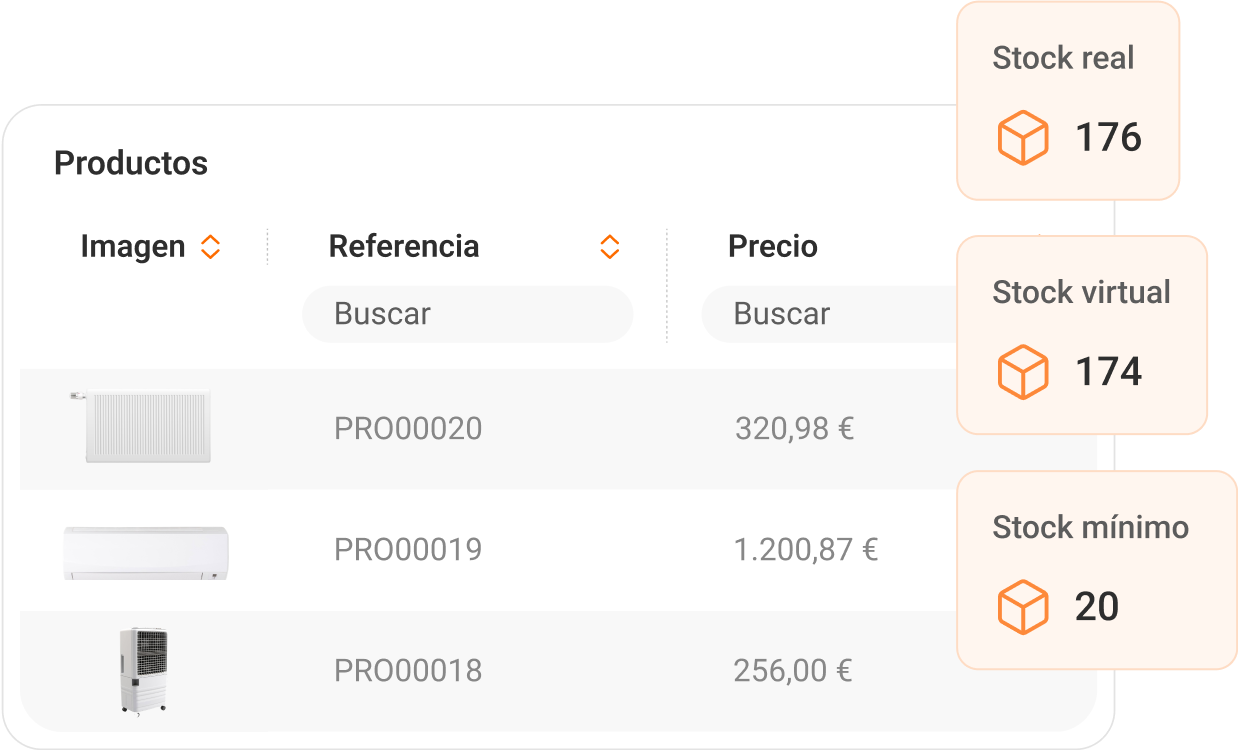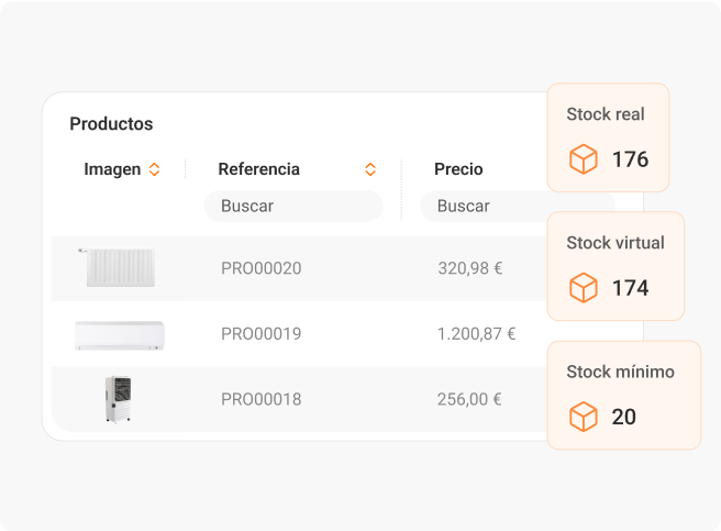 Gestiona todo tu catálogo de productos controlando el stock real y virtual, precio mínimo de venta, margen comercial, descuentos y tarifas especiales.