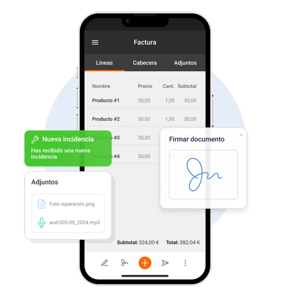 Crea albaranes y partes de trabajo desde tu móvil o tablet, recoge la firma del cliente en el momento y registra cada intervención sin esperas.