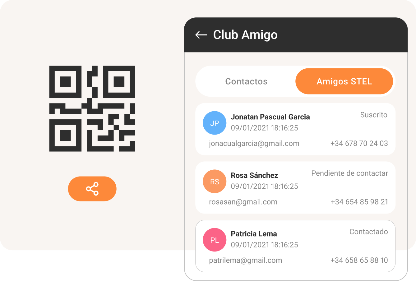 Compartir STEL Order con tus amigos nunca había sido tan fácil. Mejoramos la movilidad del Club Amigo, incluyéndolo también en la app. Comparte contactos desde tu agenda y utiliza el QR para recomendar STEL Order en menos de un minuto.