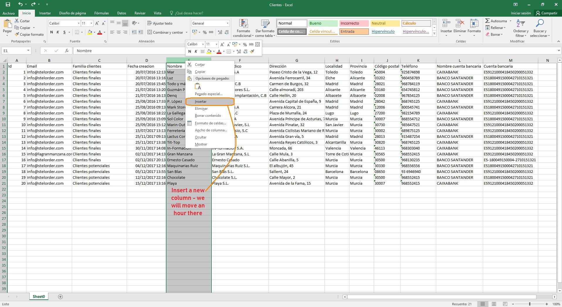 First, you need to insert a new column, into which an hour will be inserted. Right-click on a column on the right-hand side and select “Insert”. Next, follow the steps showed in pictures.