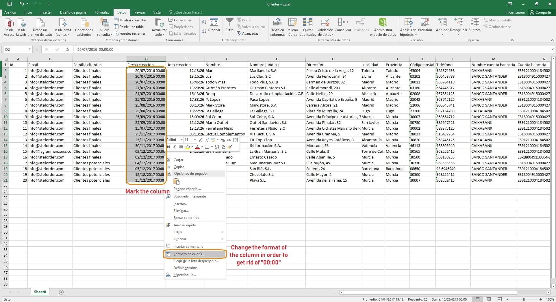 Now, we should change the format of the date column in order to get rid of “00:00”.