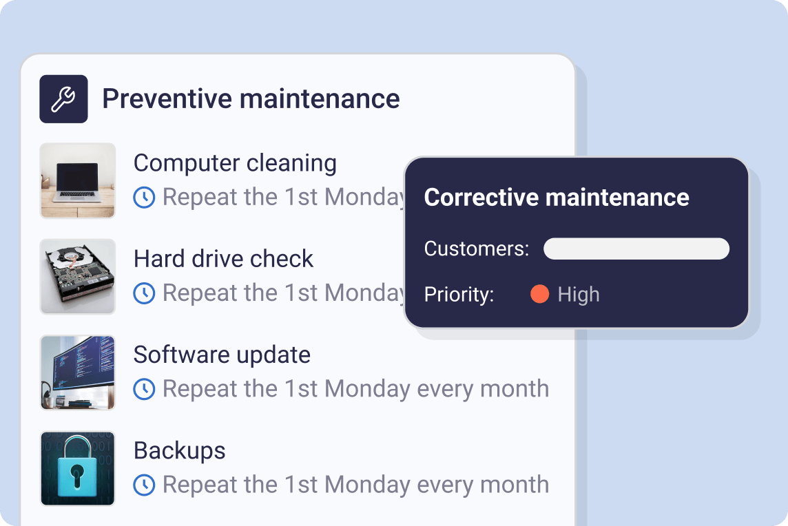 Easily create quotes, work notes, and invoices with a clear process and end-to-end traceability for every action and customer. Schedule periodic maintenance on your client’s equipment, ensuring resources are used efficiently and services are provided in an organized manner. And so much more!