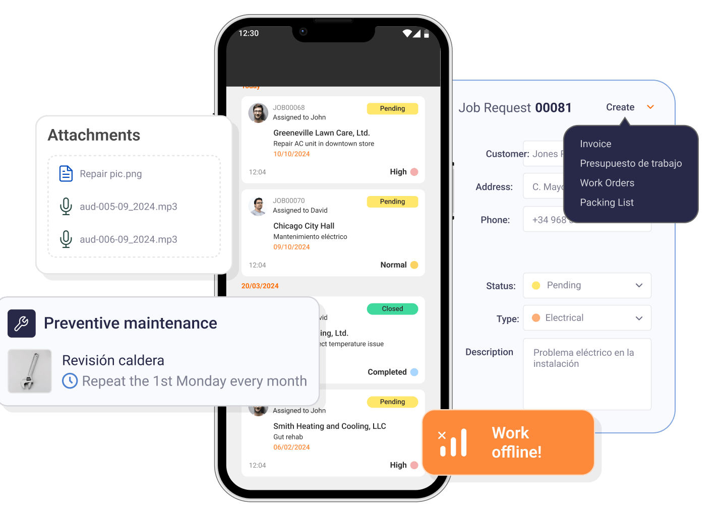 In addition, you can create commercial documentation related to the job request, such as quotes and invoices, and add multimedia elements like photos and audio for more complete documentation.