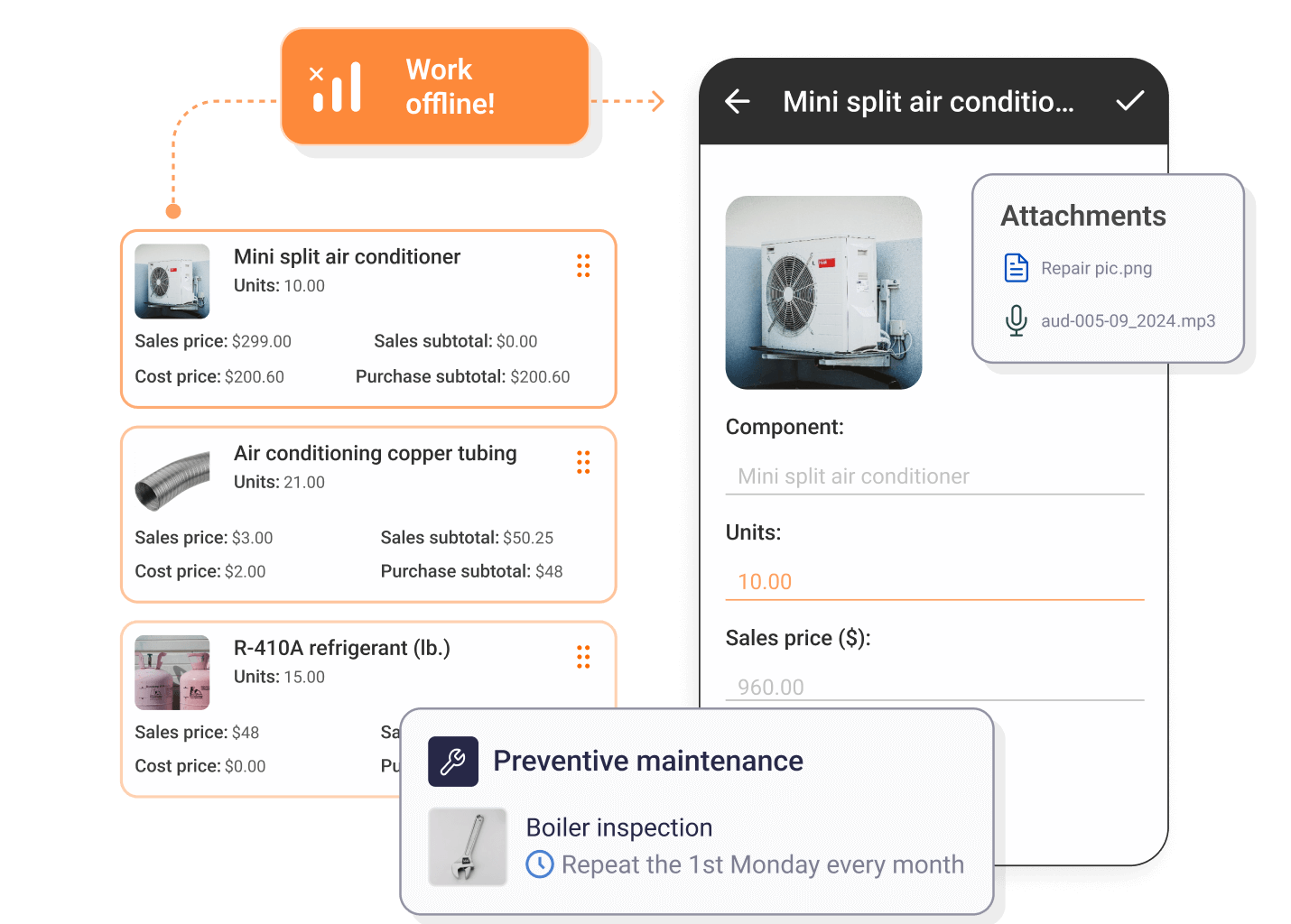 Schedule periodic maintenance for these assets and keep all your work notes organized, including warranty info, photos and videos of repairs, and client signatures approving the work.