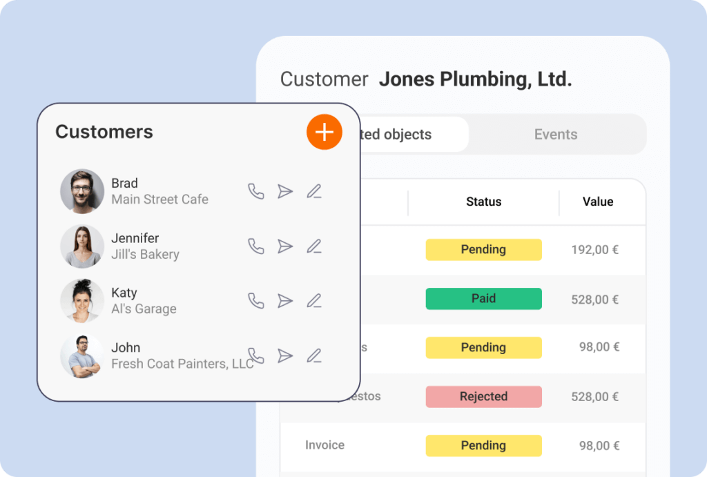 Create multiple calendars and organize different areas of your business easily. Create custom event types and manage all your activities and tasks. Never miss an important meeting with instant push-notifications on your phone and in your email. Create recurring events to help you automate periodic and repetitive tasks and activities. This ensures all your meetings, jobs, tasks and other important events are centralized in a single place, so nothing falls through the cracks.