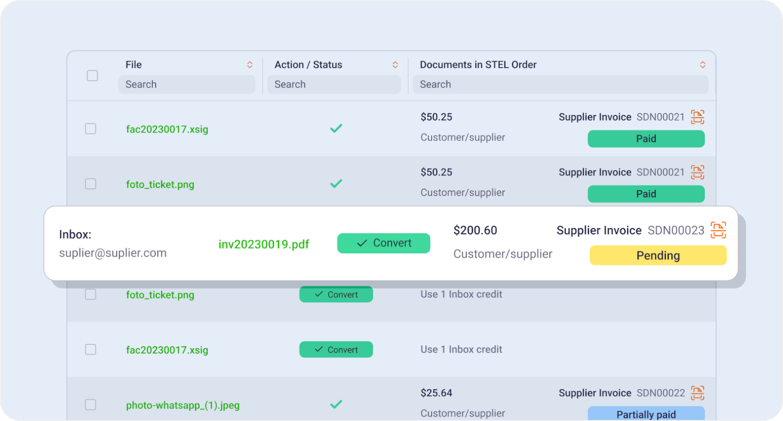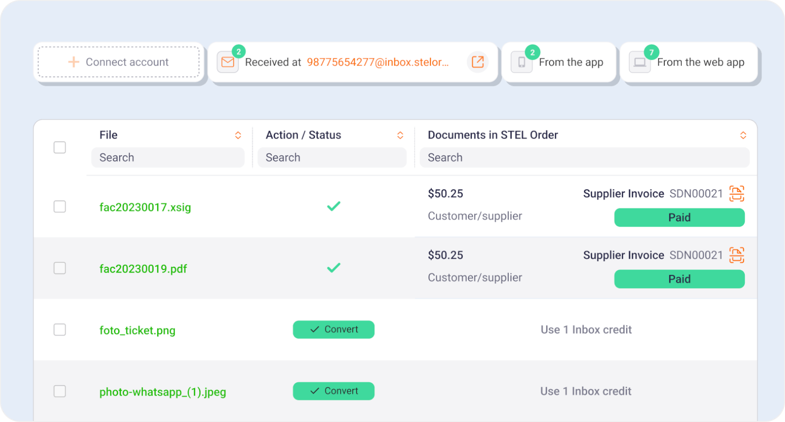 Convert any receipts and invoices you need into STEL Order documents manually, for free.
