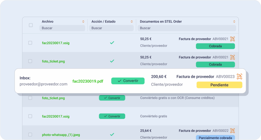 El OCR (reconocimiento óptico de caracteres) de STEL Order identifica automáticamente la información de tus facturas, albaranes o pedidos y la transforma en datos reales dentro del ERP.