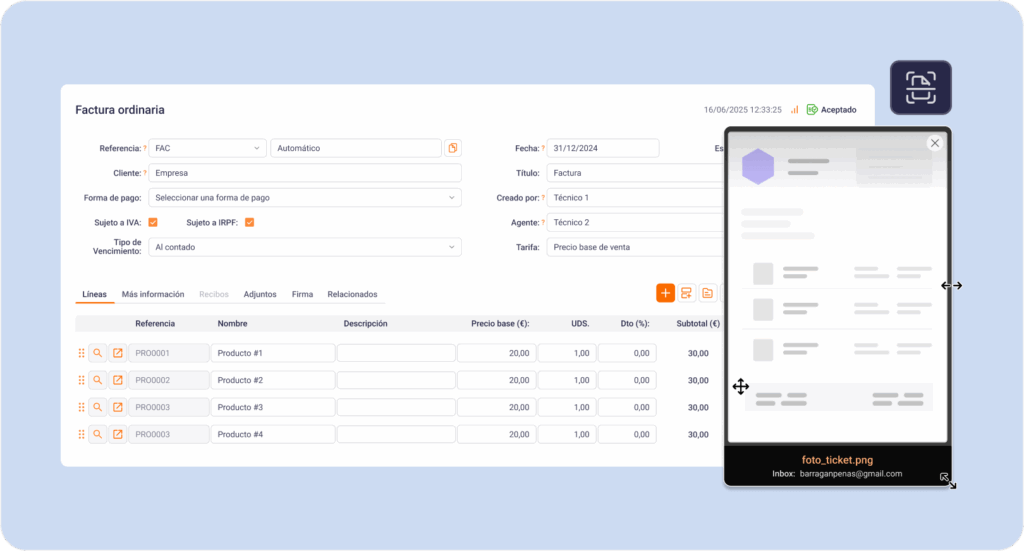 Puedes procesar cualquier documento que contenga texto legible: facturas de compra, albaranes, tickets, pedidos, presupuestos o recibos. El sistema admite archivos en PDF o imágenes (JPG, PNG) y también documentos fotografiados desde el móvil.