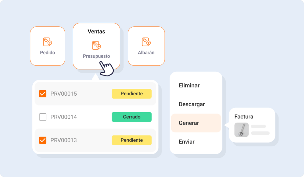 Convierte presupuestos en pedidos, albaranes o facturas. Genera presupuestos recurrentes y visualiza informes por cliente, empleado o producto.