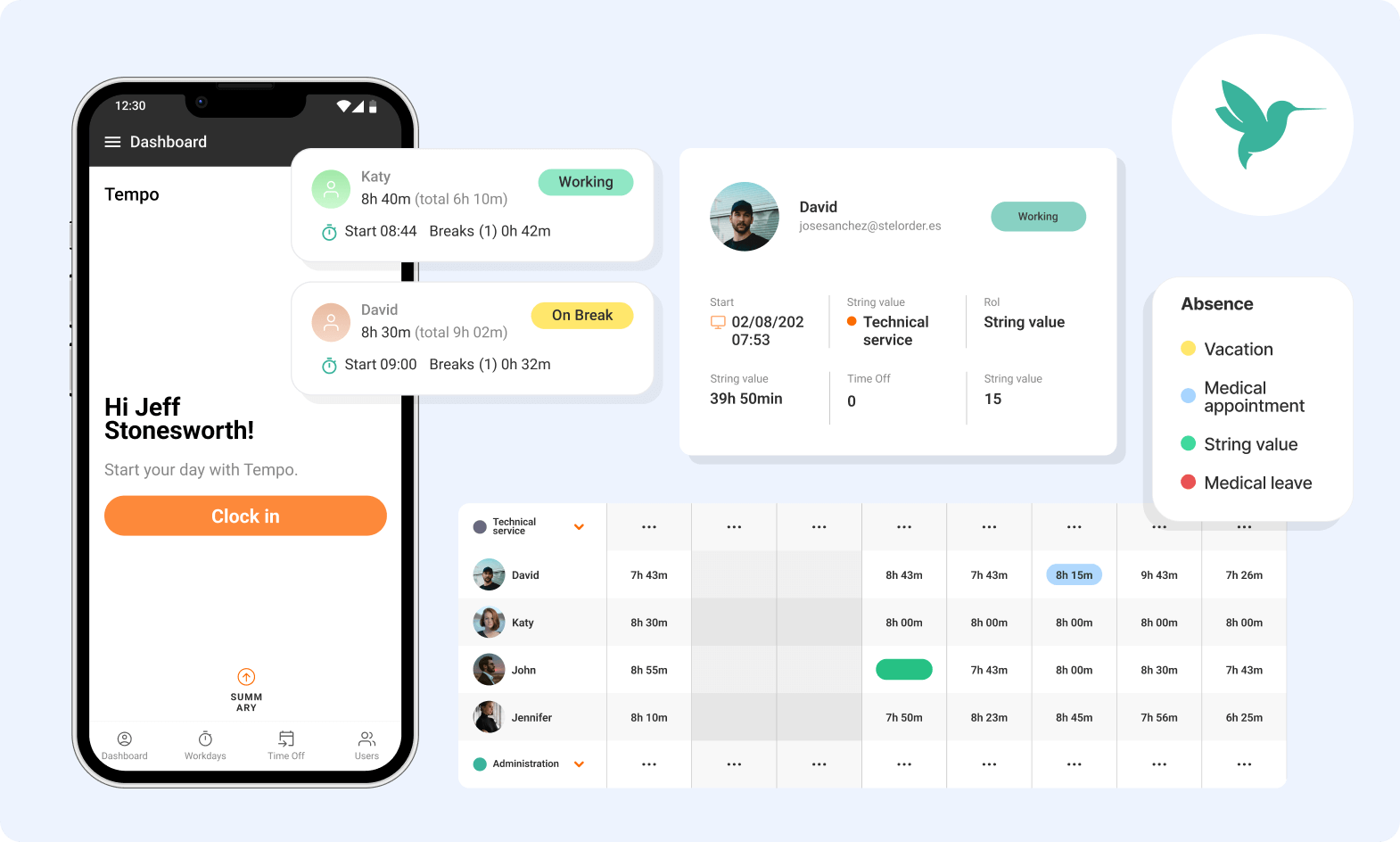 Every user has a personal Tempo profile where they can clock in and out, request time off, specify the reason for the request and attach information or documentation to justify the absence. In addition, Tempo improves your workflow and team unity because you can grant permission to view when co-workers are working, on break, or have finished their workday, among other things.