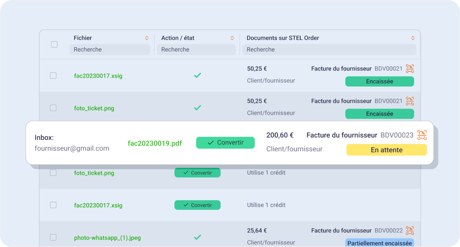 Recevez dans votre Inbox Achats tous vos tickets de caisse ou factures fournisseur, qu’ils soient en PDF, JPEG, PNG ou en factures électroniques au format .xml ou .xsig.