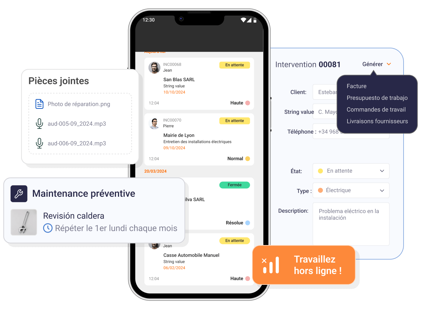 Notre logiciel de service technique vous permet de créer des factures, des bons de travail et des devis à partir de ces interventions, améliorant ainsi l’efficacité et le flux de travail dans votre entreprise.