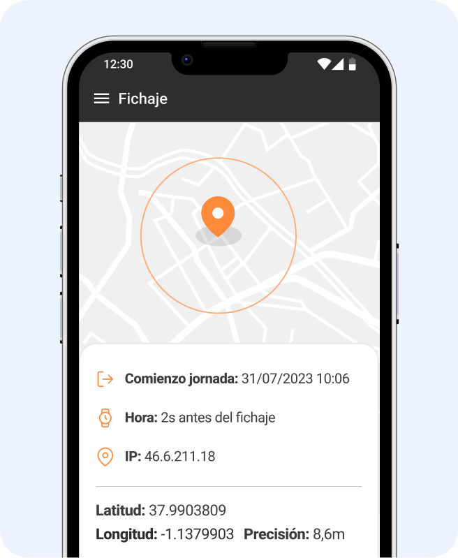 Tus empleados podrán registrar su jornada con pausas, imágenes y observaciones. Si lo hacen desde la aplicación también podrás ver desde qué lugar han fichado.