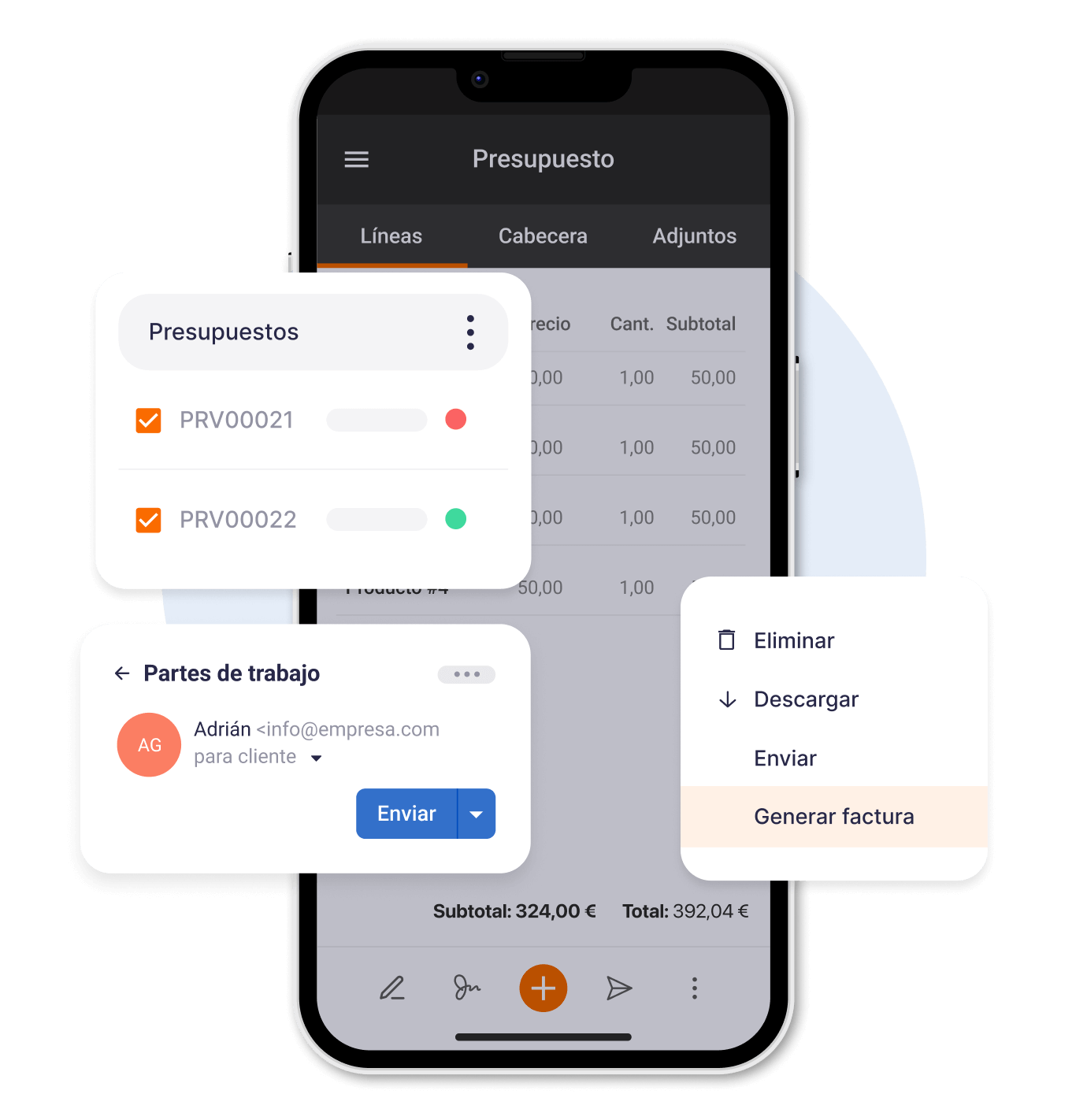 Crea partes, facturas o presupuestos offline. No te preocupes si te quedas sin conexión en la app; se sincronizarán automáticamente al recuperarla.